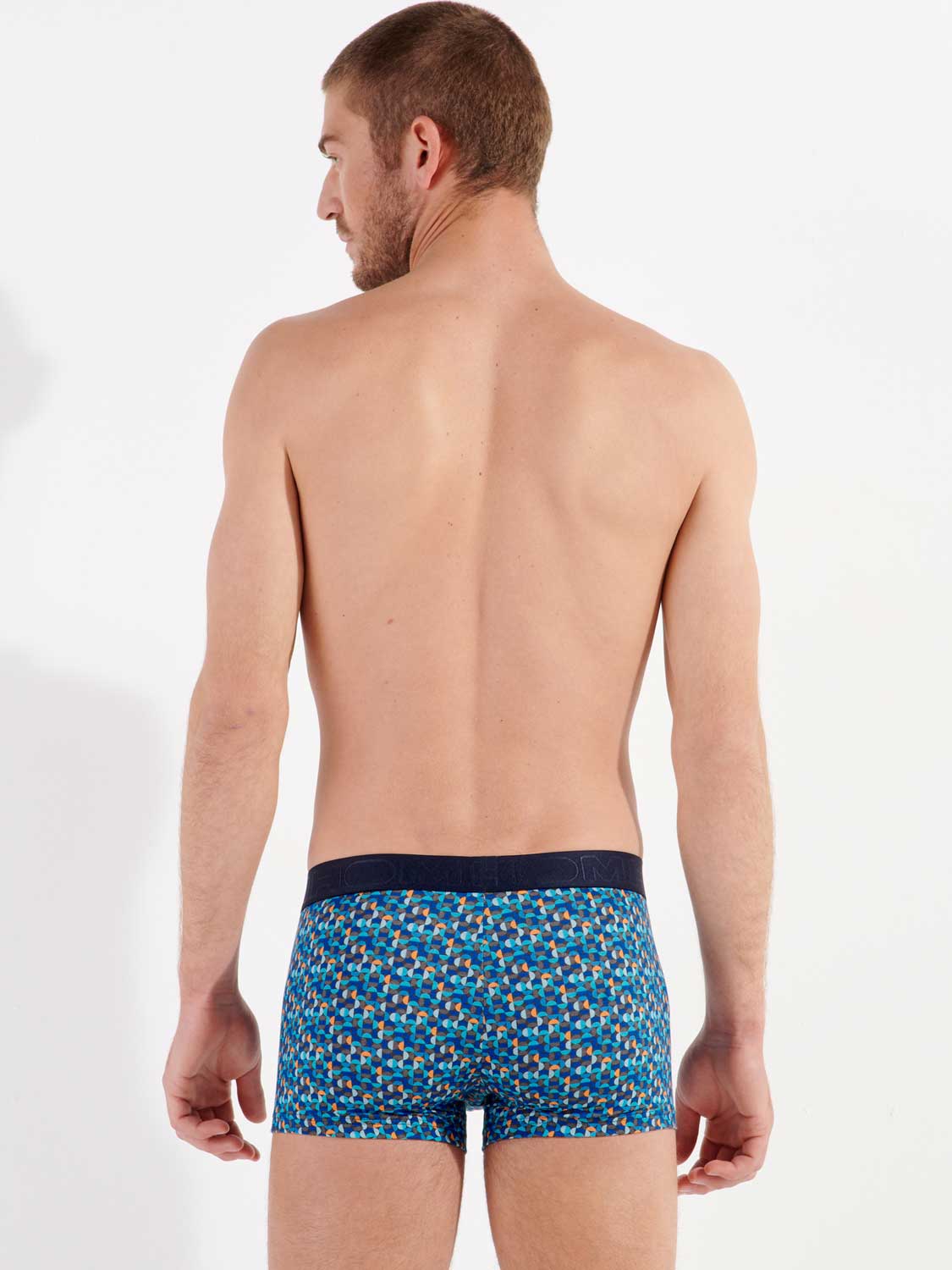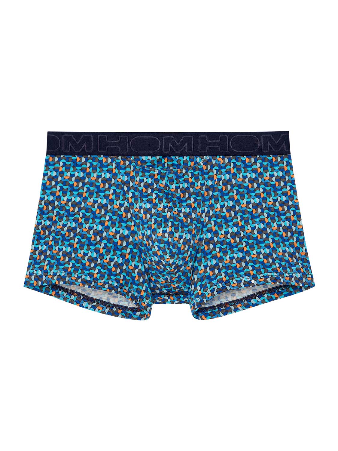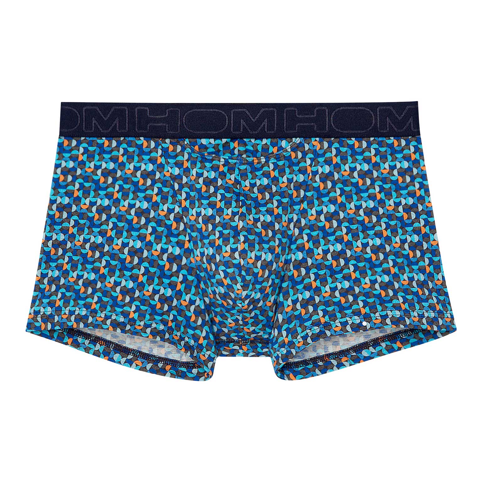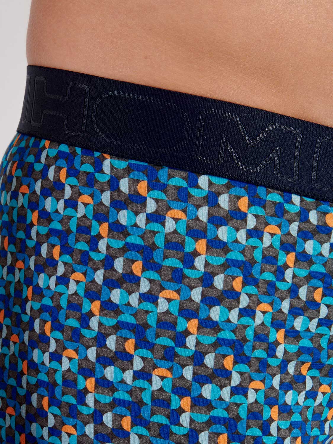 Die Ralphy - HO1 Boxershorts ist aus Baumwollmodal gefertigt und verfügt über die von HOM bekannte "horizontale Öffnung", den speziellen Schlitz für zusätzlichen Komfort. Diese Herren-Boxershorts haben einen schönen Druck in Blau, Grau mit orangefarbenen Akzenten auf einem marineblauen Hintergrund. Die Ralphy hat einen elastischen Bund mit dem HOM-Logo darauf.