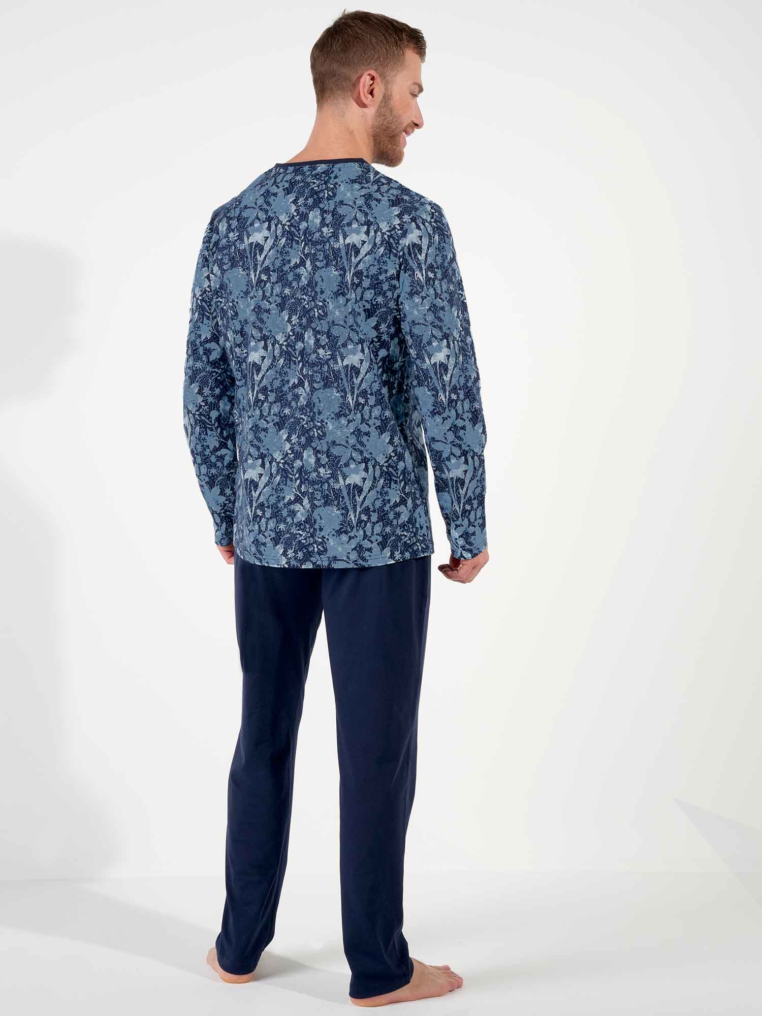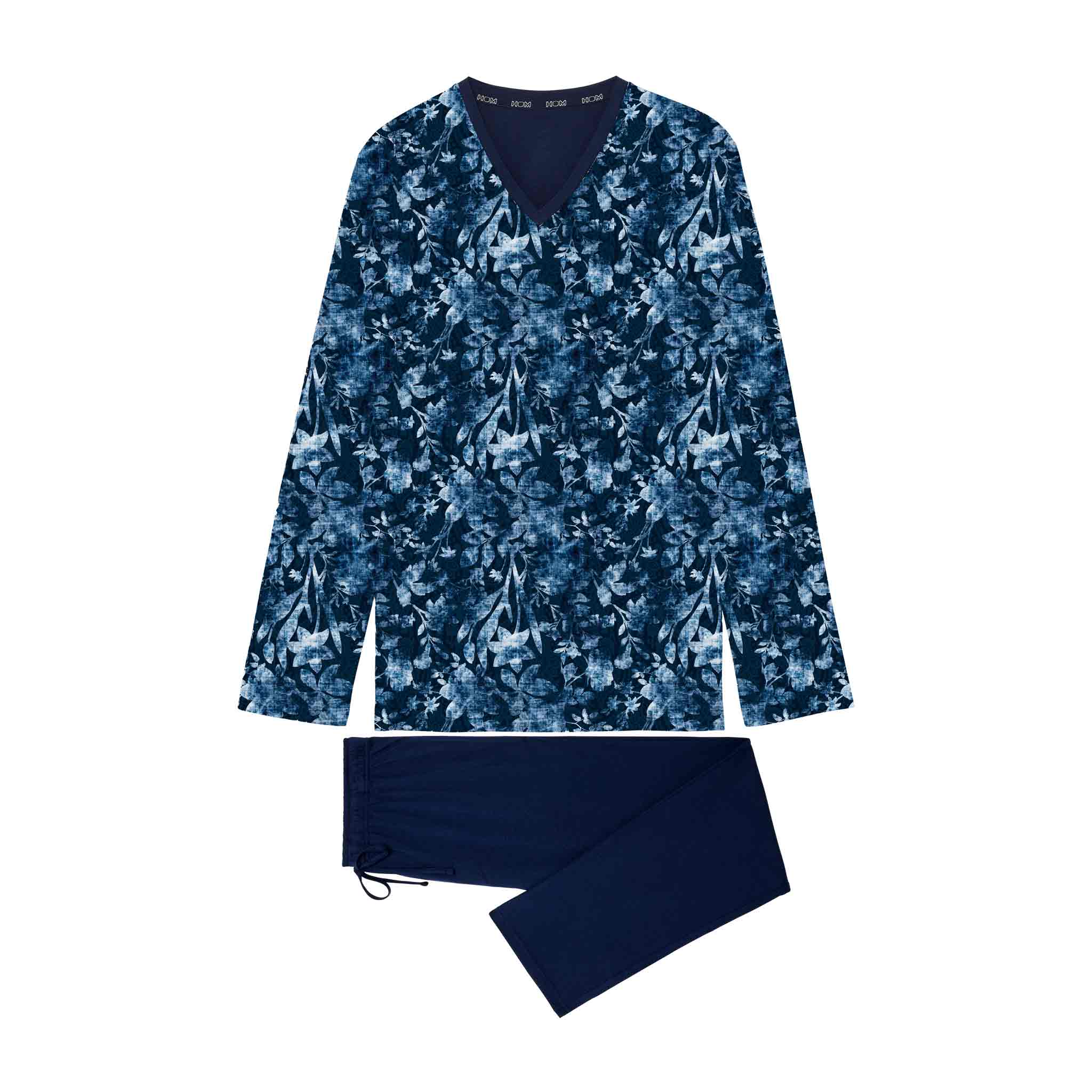 Der Compiegne Pyjama vereint künstlerischen Ausdruck mit einem entspannten Look. Aus 100 % Baumwolle gefertigt, fühlt sich das Material angenehm weich auf der Haut an. Das Oberteil ist mit einem floralen Print in verwaschenen Jeansblautönen verziert, der an ein Aquarellgemälde erinnert. Der tiefe V-Ausschnitt mit dunkelblauer Einfassung und das dezente HOM-Logo runden das Design elegant ab. Die einfarbige, dunkelblaue Hose mit geradem Bein und Kordelzug sorgt für höchsten Komfort beim Schlafen oder Entspannen. Eine stilvolle Wahl für Männer mit Anspruch an Charakter und Komfort.