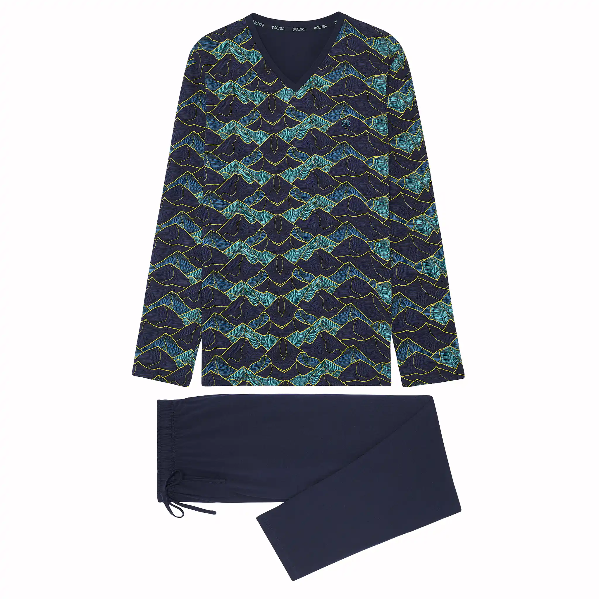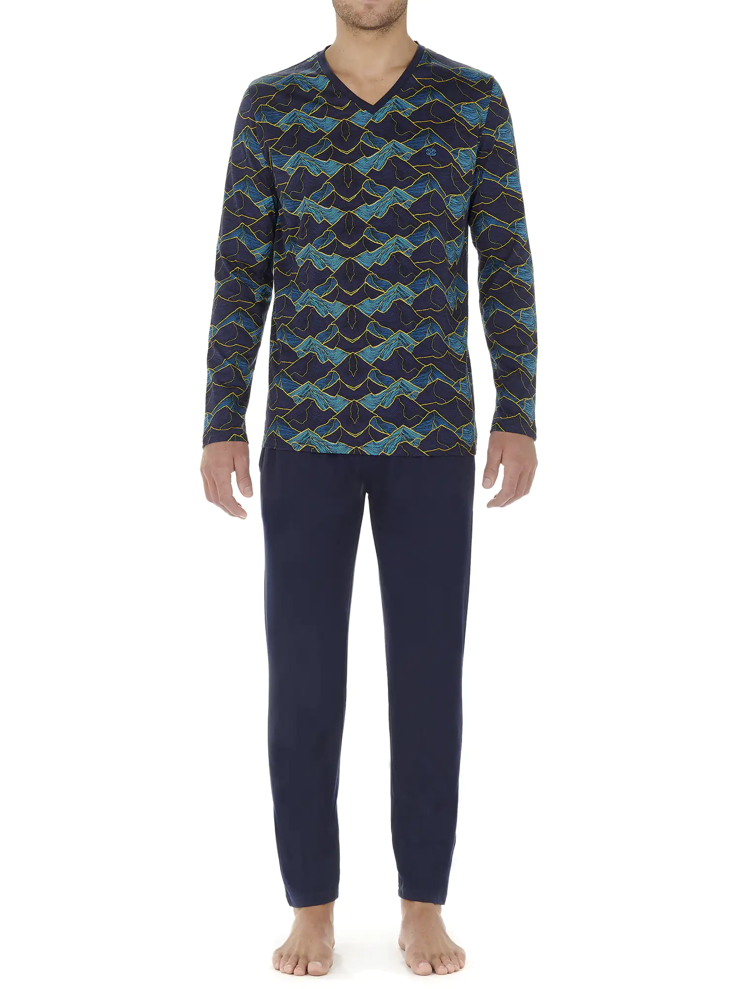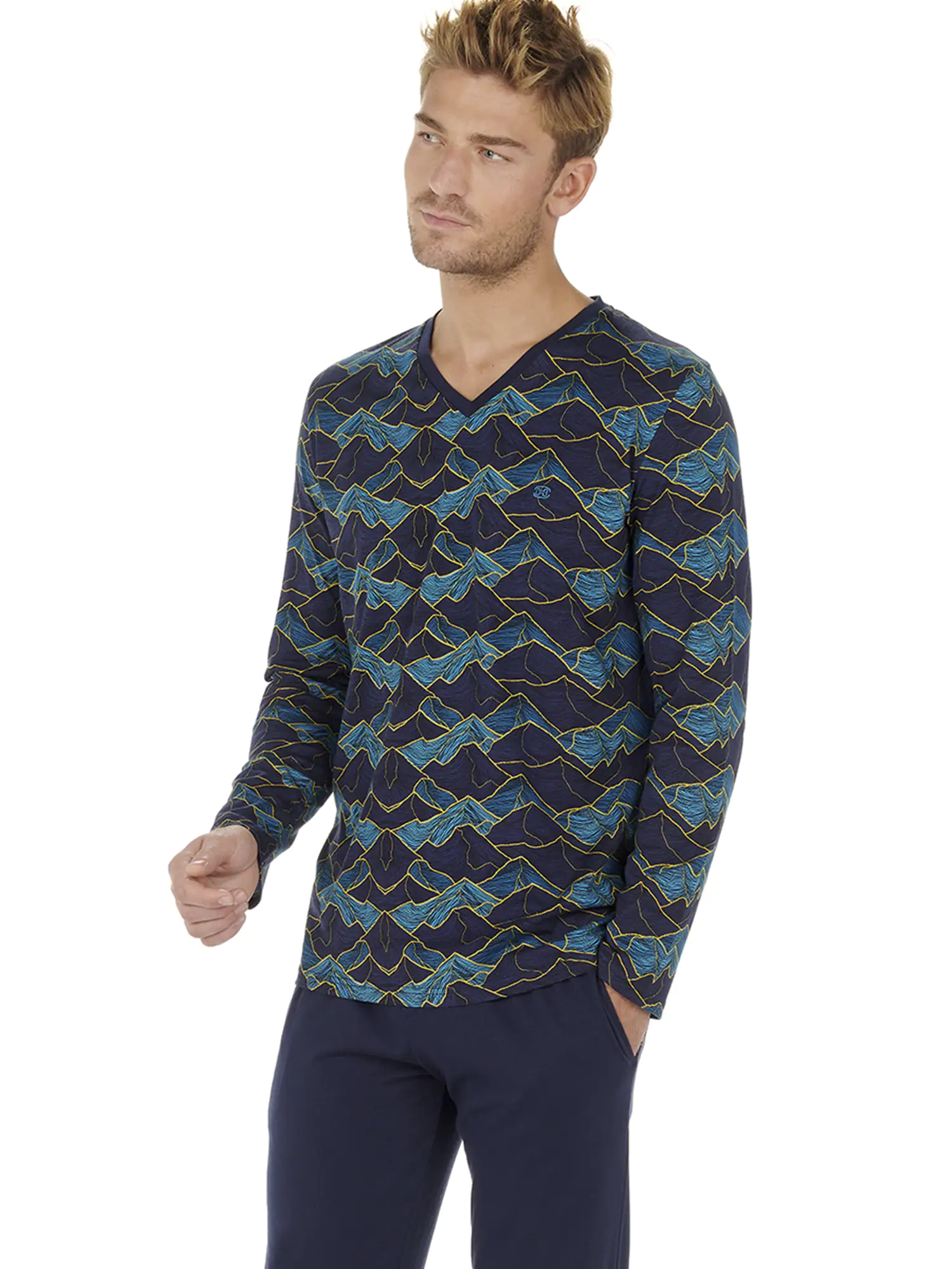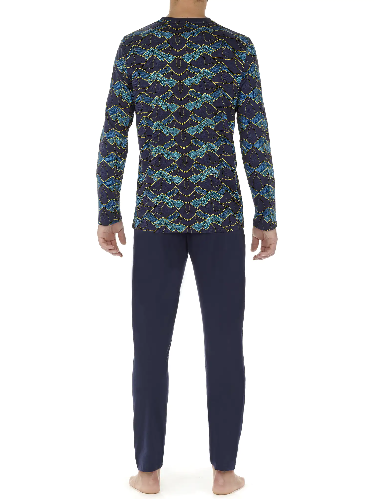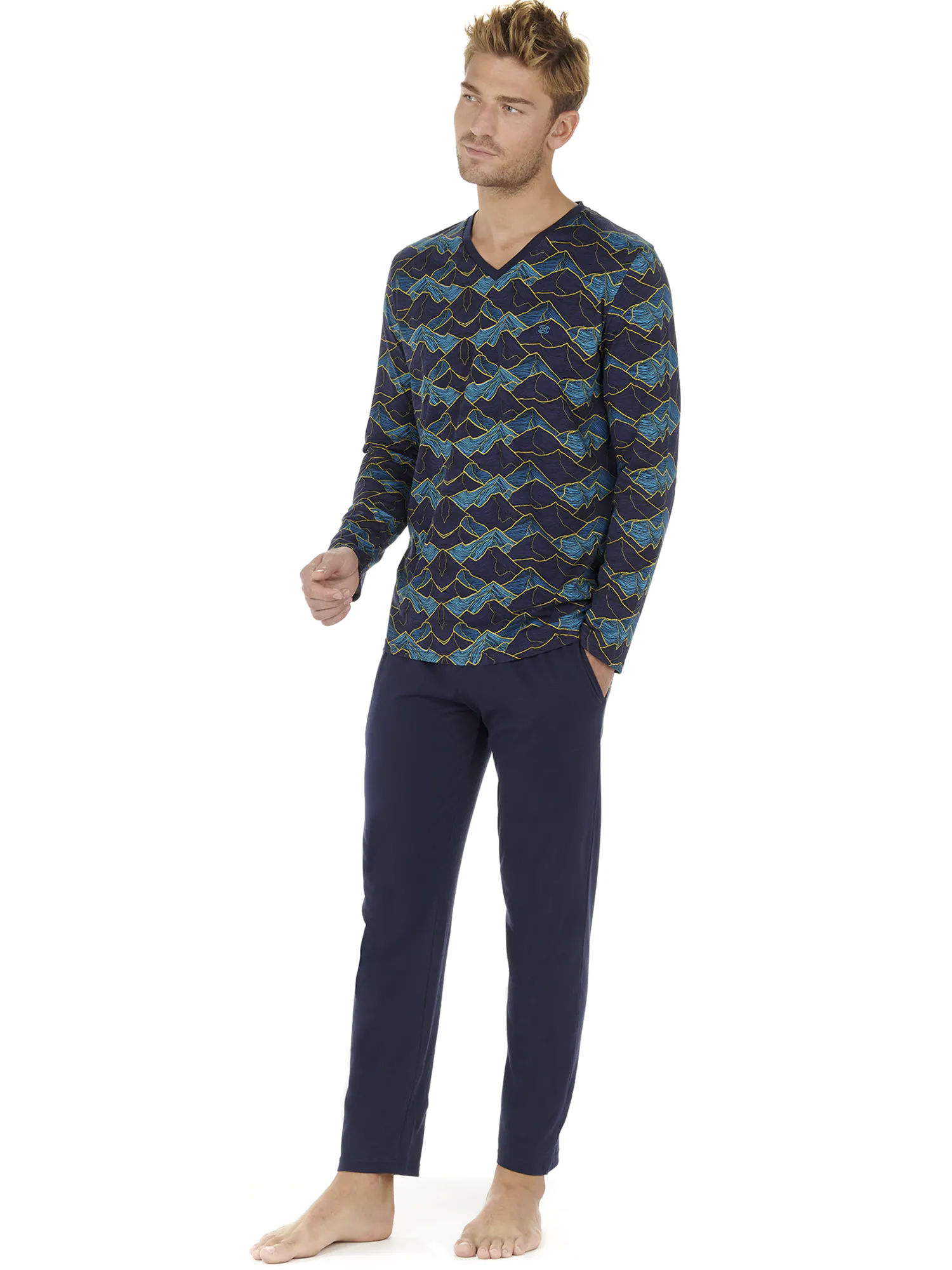Der Lino Herren-Schlafanzug ist aus 100% Jersey-Baumwolle gefertigt. Das langärmelige T-Shirt hat einen V-Ausschnitt. Das Shirt hat einen auffälligen Allover-Landschaftsdruck mit Bergen in Blautönen auf marineblauem Hintergrund. Die lange Hose in schlichtem Marineblau hat links und rechts am Saum Eingrifftaschen. Der Bund ist elastisch und hat einen Kordelzug. Da der Pyjama aus Baumwolle besteht, ist er pflegeleicht und atmungsaktiv. Ideal für den Mann, der gerne natürliche Stoffe trägt.