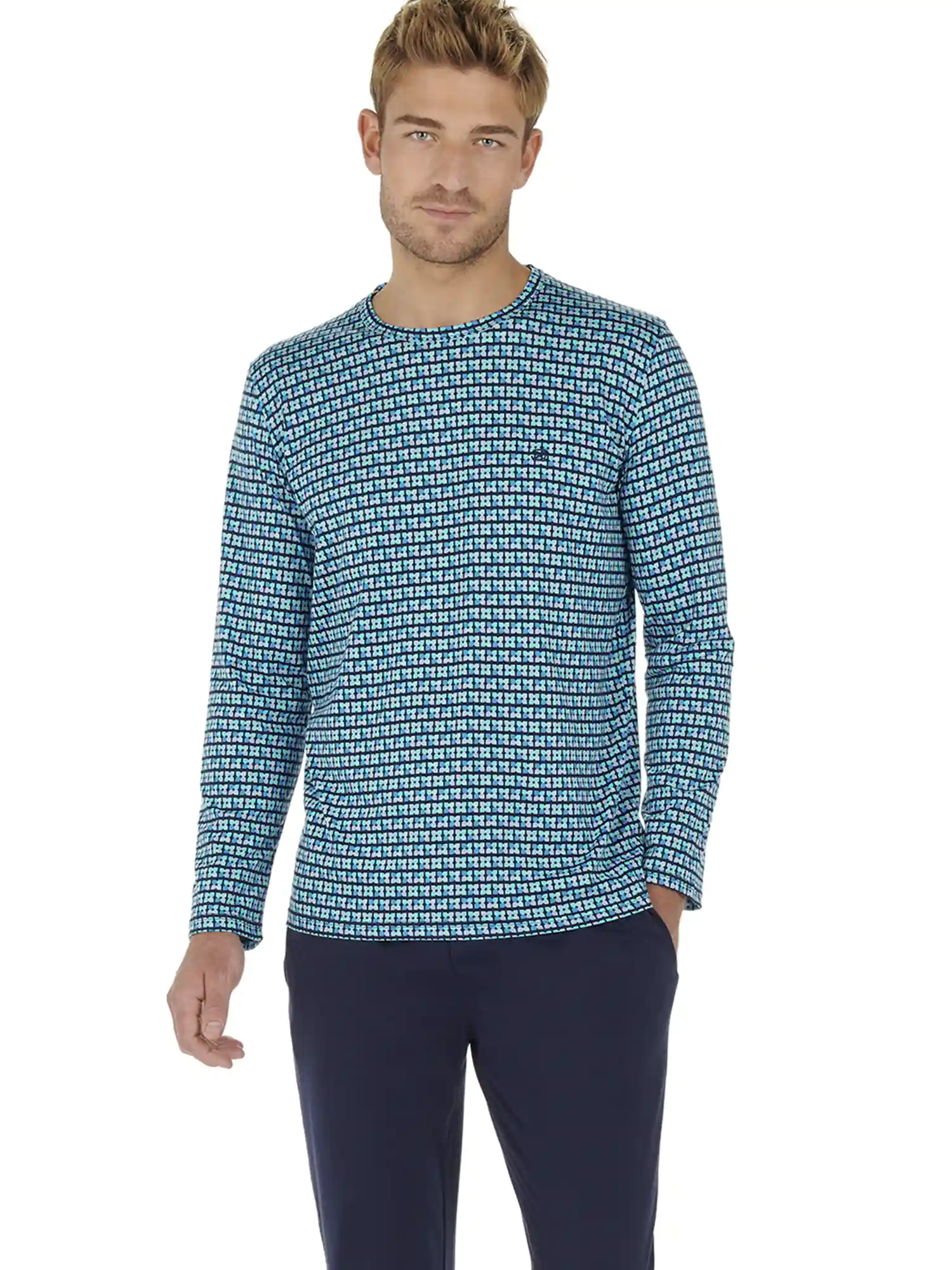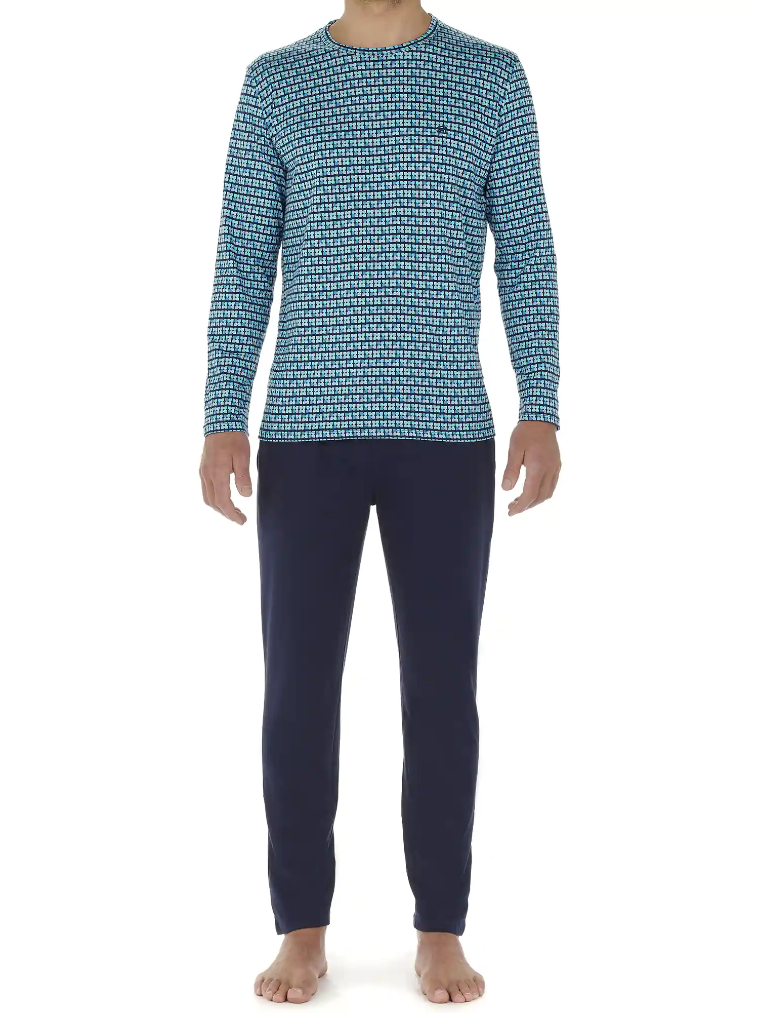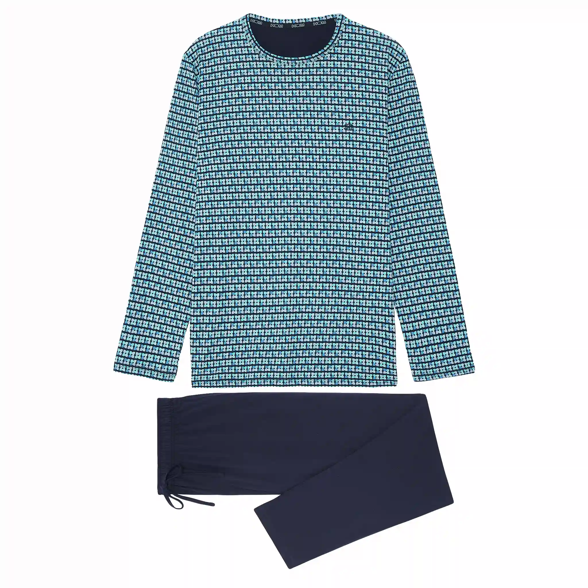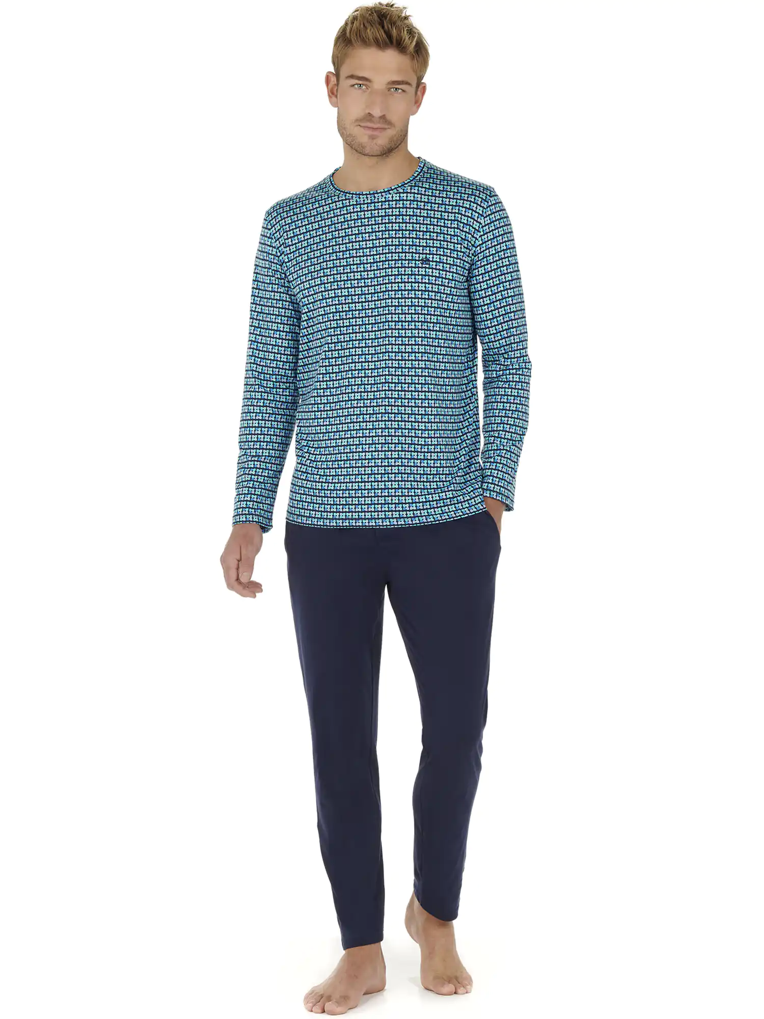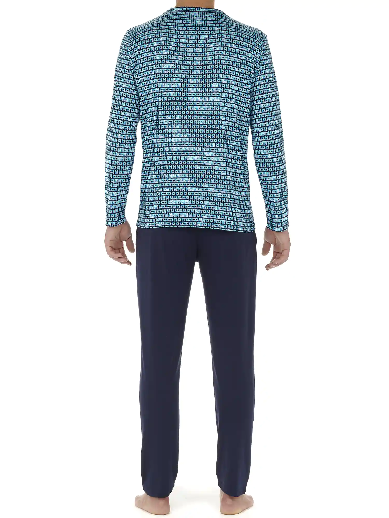 Der Schlafanzug Andy für Herren ist aus 100% Jersey-Baumwolle gefertigt. Das langärmelige T-Shirt hat einen Rundhalsausschnitt und eine klassische Öffnung. Das Shirt hat einen Druck mit Ovalen in hellen Grüntönen auf marineblauem Hintergrund. Die lange Hose in schlichtem Schwarz hat links und rechts am Saum Schlitztaschen. Der Bund ist elastisch und hat einen Kordelzug. Da der Pyjama aus Baumwolle besteht, ist er pflegeleicht und atmungsaktiv. Ideal für den Mann, der gerne natürliche Stoffe trägt.