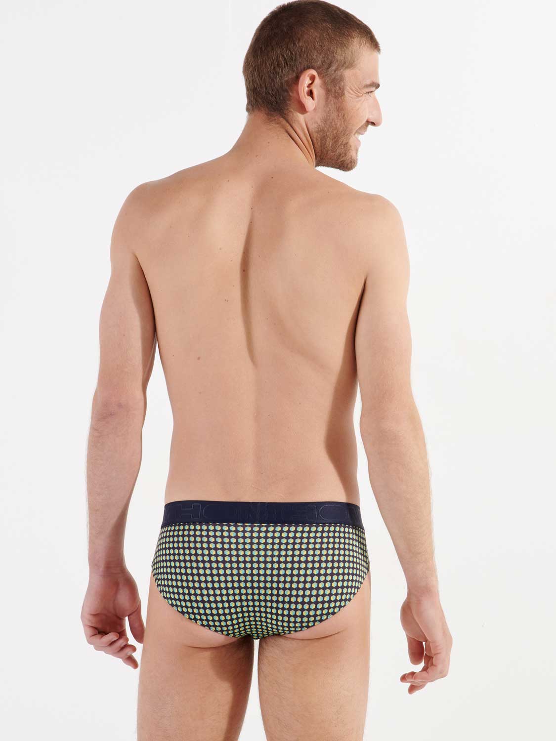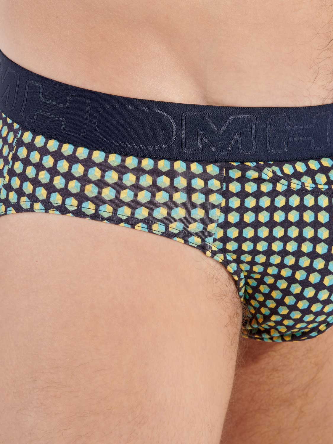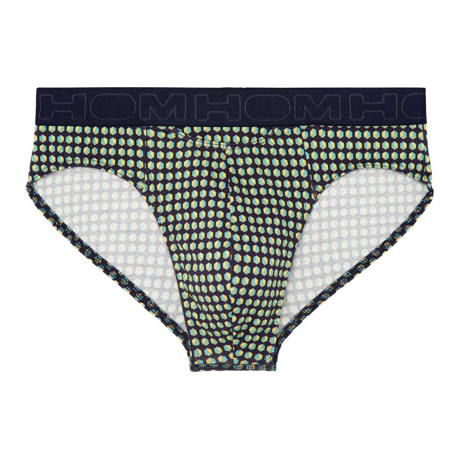 Der Filippo - HO1 Mini Slip ist aus hochwertigem Baumwollmodal gefertigt und verfügt über die von HOM bekannte "horizontale Öffnung", den speziellen Schlitz für zusätzlichen Komfort. Der Herrenslip hat einen auffälligen geometrischen Druck in Grünblau mit gelben Akzenten auf marineblauem Hintergrund. Der Filippo hat einen elastischen Bund mit dem HOM-Logo darauf.