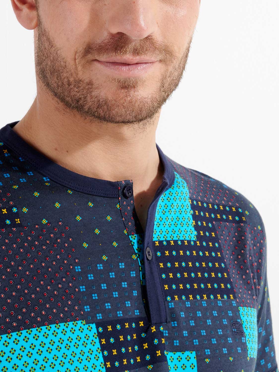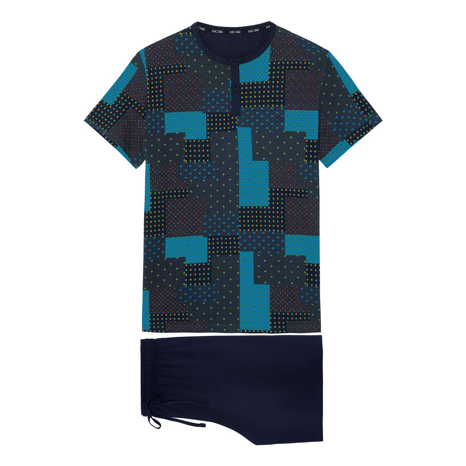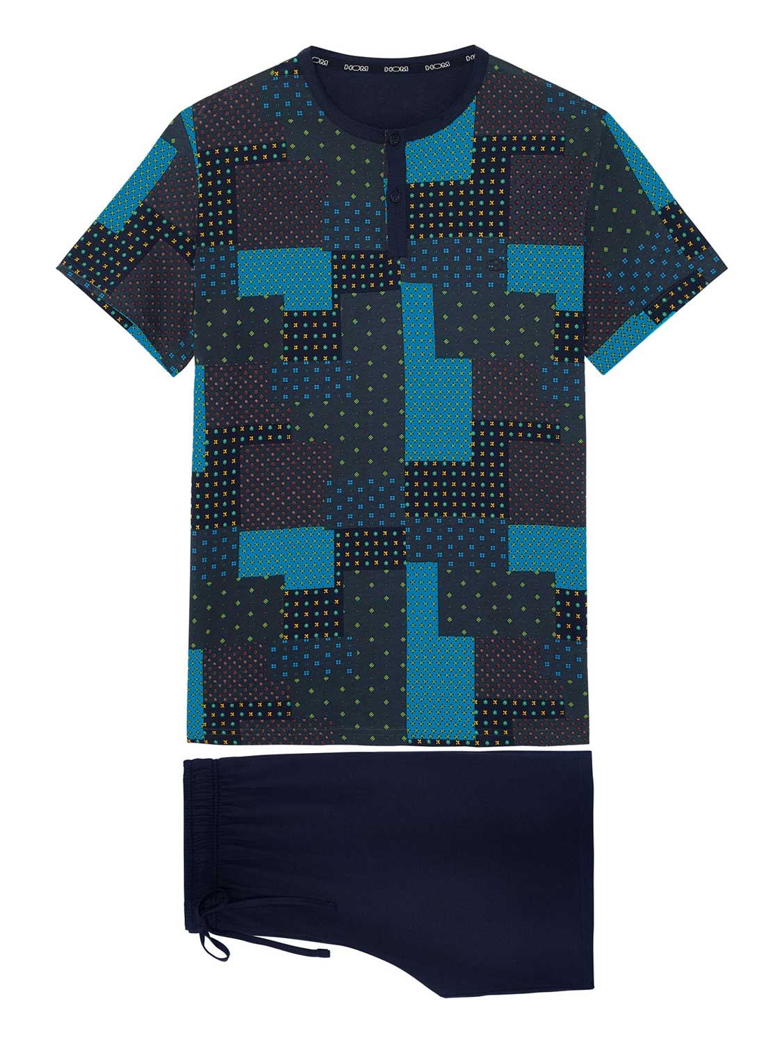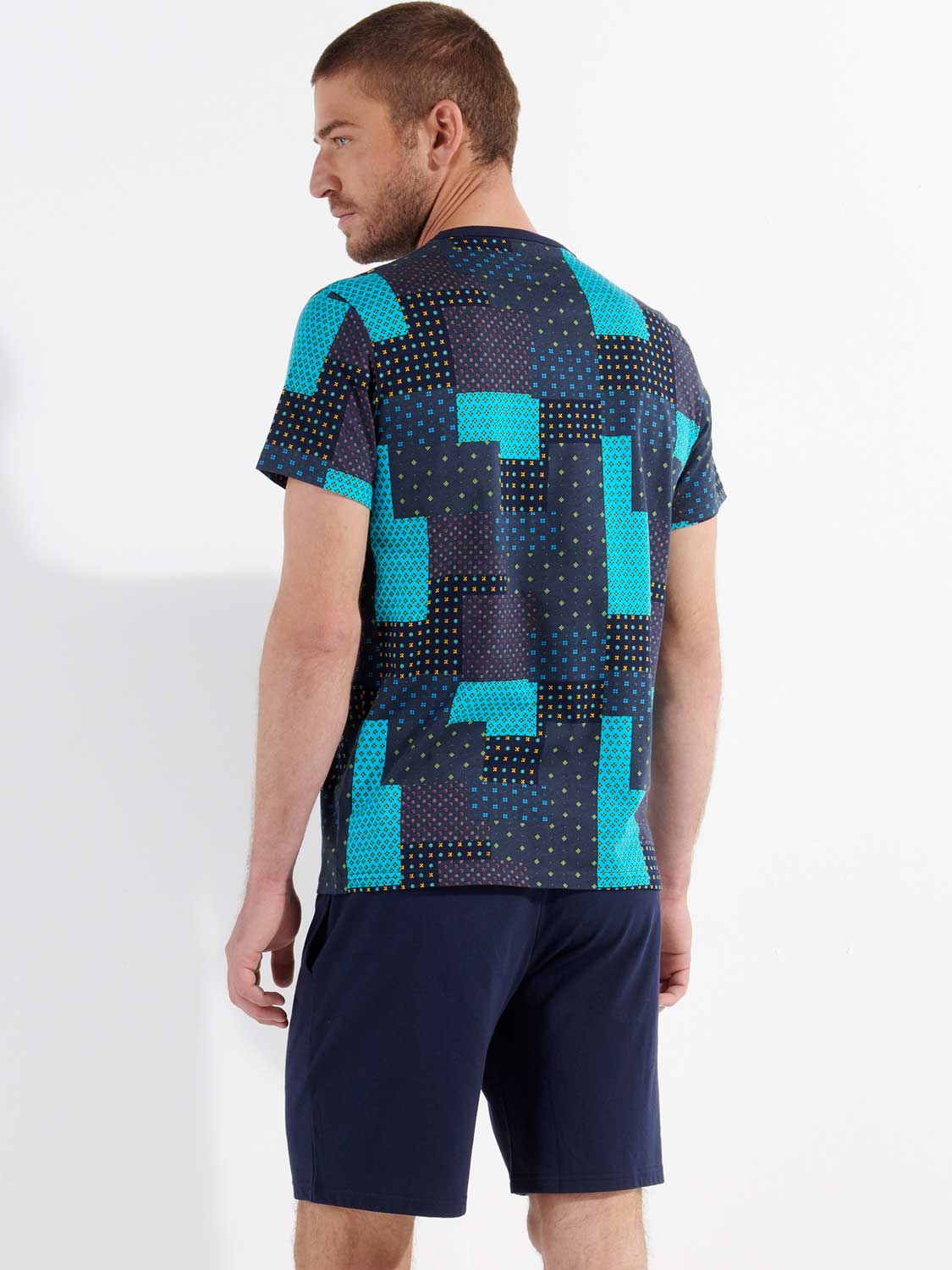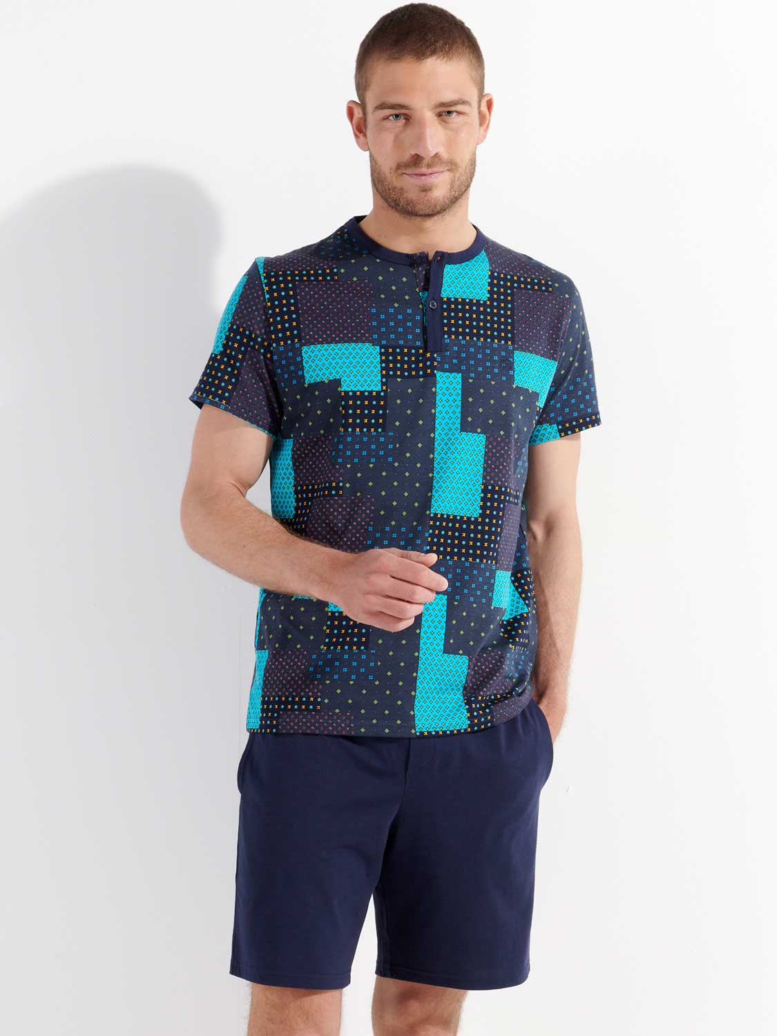 Die Alton - Short Sleepwear ist aus 100% Baumwolle in einer Jersey-Ausführung. Diese kurze Nachtwäsche besteht aus einem kurzärmeligen T-Shirt mit rundem Kragen und Knöpfen und einer einfarbigen Hose. Das Shirt hat ein elegantes und verspieltes Patchwork-Muster in Blau, Marineblau und Schwarz mit Akzenten in Gelb und Orange. Der Kragen kann mit den Knöpfen geöffnet werden. Die Shorts haben links und rechts Seitentaschen im Saum und sind mit einem Kordelzug versehen, der für einen perfekten Sitz sorgt.